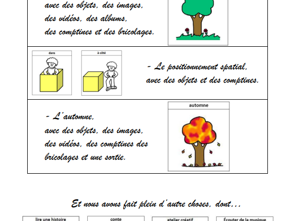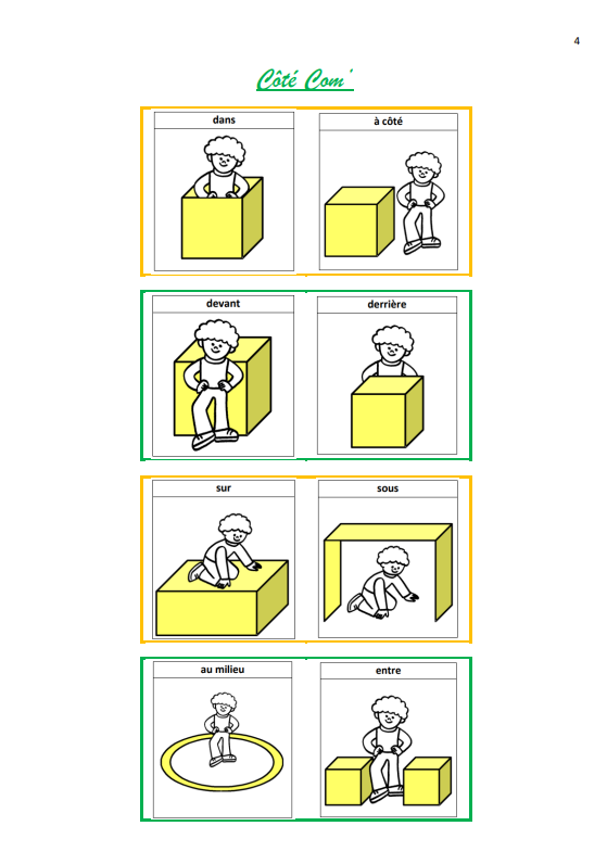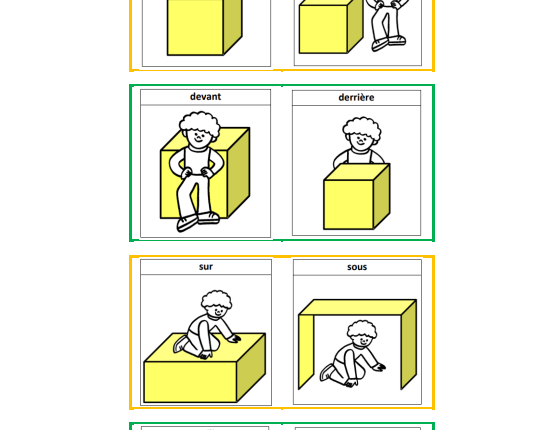 Dans un premier temps, les enfants ont travaillé le positionnement spatial des objets, savoir placer un objet entre et au milieu et différentes situations de mise en action comme se placer entre et au milieu. Ces temps d’apprentissage étaient ponctués de comptines, offrant aux enfants des moments de calme et de détente en fin de séance.